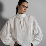 MAY est une blouse brodée en voile de coton. Sa coupe oversize avec un empiècement épaule et une emmanchure brodés à la main vient lui donner son caractère. Loin d'être un uniforme, cette pièce est à la fois aérienne et structurée qui lui donne une élégance intemporelle.